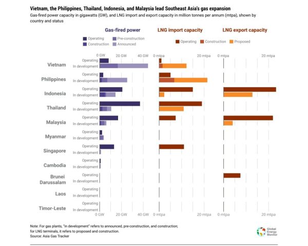 Indonesia bukan satu-satunya di Asia Tenggara yang ekspansi infrastruktur gas besar-besaran. GEM mencatat, terdapat total 100 GW pembangkit listrik tenaga gas, 47 mtpa fasilitas impor LNG, dan 16,7 mtpa fasilitas ekspor LNG, yang sedang dikembangkan di Asia Tenggara. Biaya Pembangunan seluruh fasilitas tersebut mencapai US$220 miliar. Indonesia bersama Vietnam, Filipina, Malaysia, dan Thailand berada di garis terdepan dalam ekspansi ini.