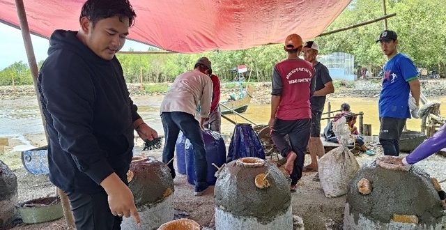 RESOURCESASIA.ID, KARAWANG – Belasan laki-laki berkumpul di pinggir muara sungai, Dusun Tangkolak, Desa Sukakerta, Karawang. Di bawah sengat matahari pantai utara Jawa, mereka mengalirkan adukan semen ke dalam sebuah cetakan berbentuk kubah, dengan beberapa lubang di permukaannya, berdiameter kira-kira 0,5 meter, dengan tinggi sekitar 1 meter. Dilihat sekilas, cetakan-cetakan itu mirip kurungan ayam. Warga lokal menyebutnya paranje.