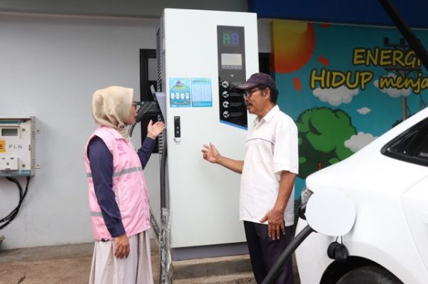Potret Srikandi PLN ketika melayani pelanggan yang hendak mengisi daya kendaraan listrik pada periode mudik Idulfitri.