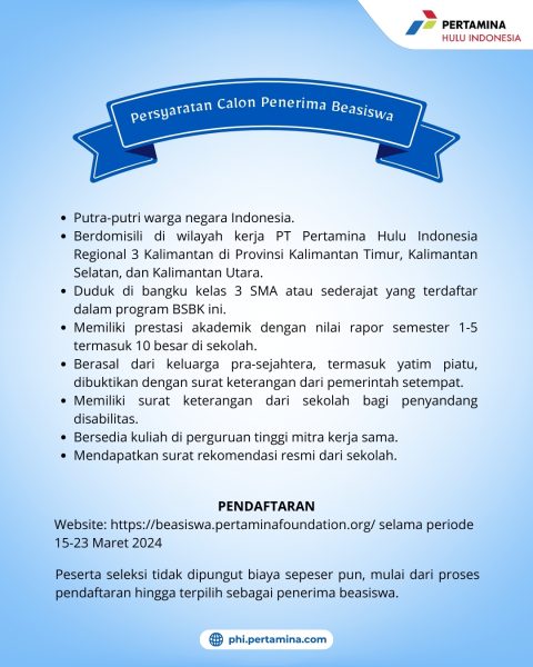 Pendaftaran BSBK dibuka mulai 15 Maret hingga 23 Maret 2024 melalui website Pertamina Foundation. Informasi seputar Program BSBK juga dapat diakses melalui media sosial resmi PT Pertamina Hulu Indonesia dan Pertamina Foundation. (Rama Julian)