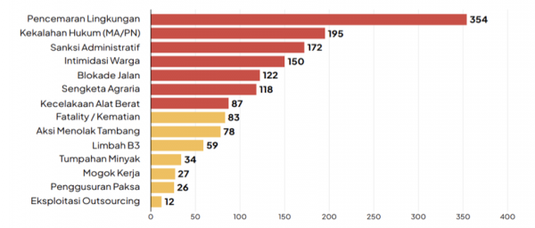 Temuan CELIOS dan PUSHAM UII periode 2020–2025, dari 15 perusahaan yang melandai dalam daftar LQ45, pencemaran lingkungan menjadi isu paling dominan dengan 354 kasus, mencerminkan tingginya tekanan aktivitas bisnis terhadap daya dukung lingkungan, disusul kekalahan hukum perusahaan di peradilan (195 kasus) dan sanksi administratif diberikan pemerintah (172 kasus). Hal tersebut menandakan lemahnya kepatuhan korporasi sekaligus kegagalan fungsi pencegahan negara di sisi yang lain. Pada saat yang sama, konflik sosial dan pelanggaran HAM berlangsung luas dan berulang melalui intimidasi warga (150 kasus), blokade jalan (122 kasus), dan sengketa agraria (118 kasus). Sementara, lemahnya perlindungan pekerja tercermin dari kecelakaan alat berat (87 kasus) hingga menyebabkan kematian (83 kasus).